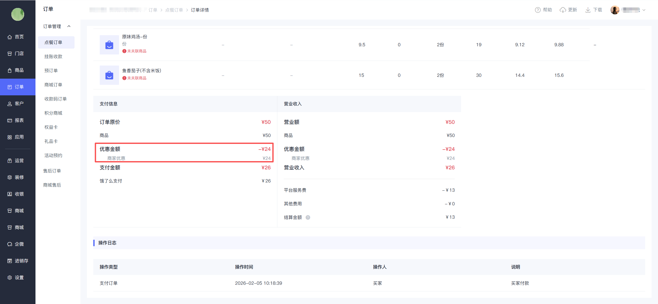 第三方外卖的订单详情增加优惠金额,可显示商家优惠和平台补贴。