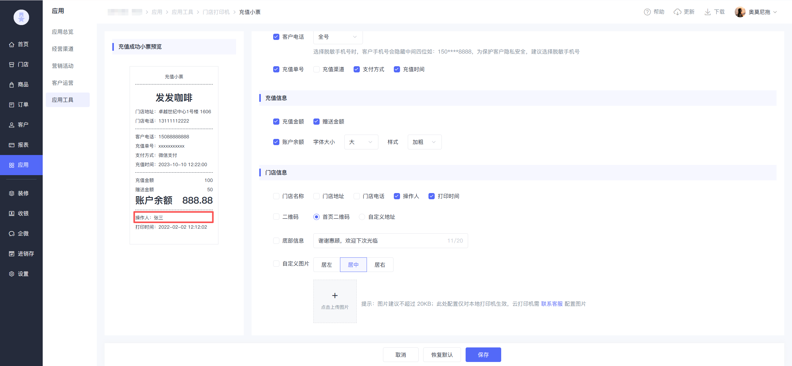 路径:品牌后台-应用-应用工具-门店打印机-充值小票