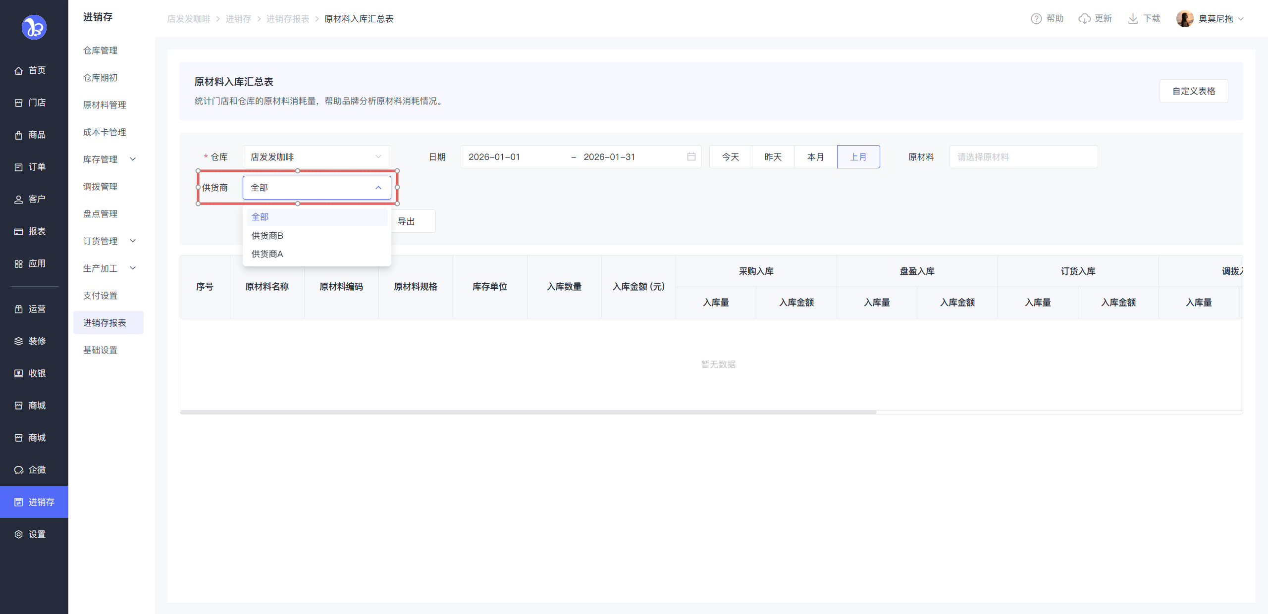 路径:品牌后台-进销存-进销存报表-原材料入库汇总表