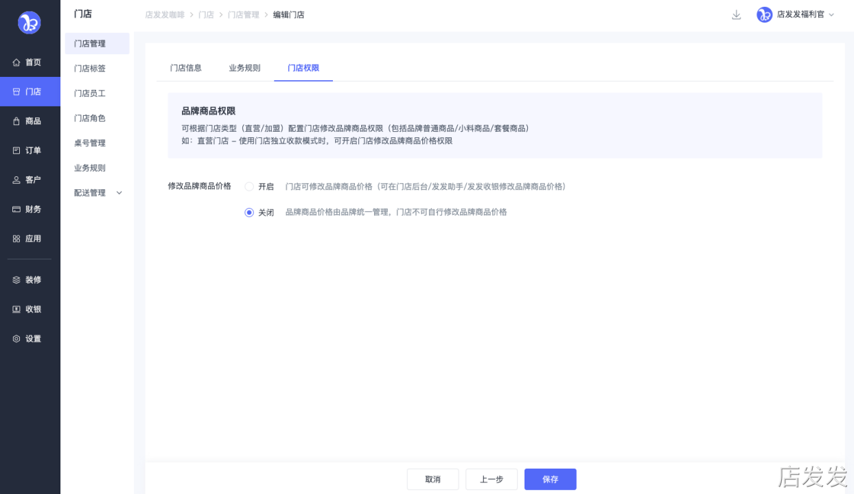 品牌商品权限:门店出售品牌商品时,无权限更改商品价格,需按照品牌设置的统一价格出售。如果需要该门店自行管理商品价格时,可启用该权限给门店;
