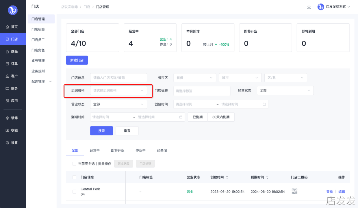 门店关联组织机构后,品牌可按组织机构管理门店;