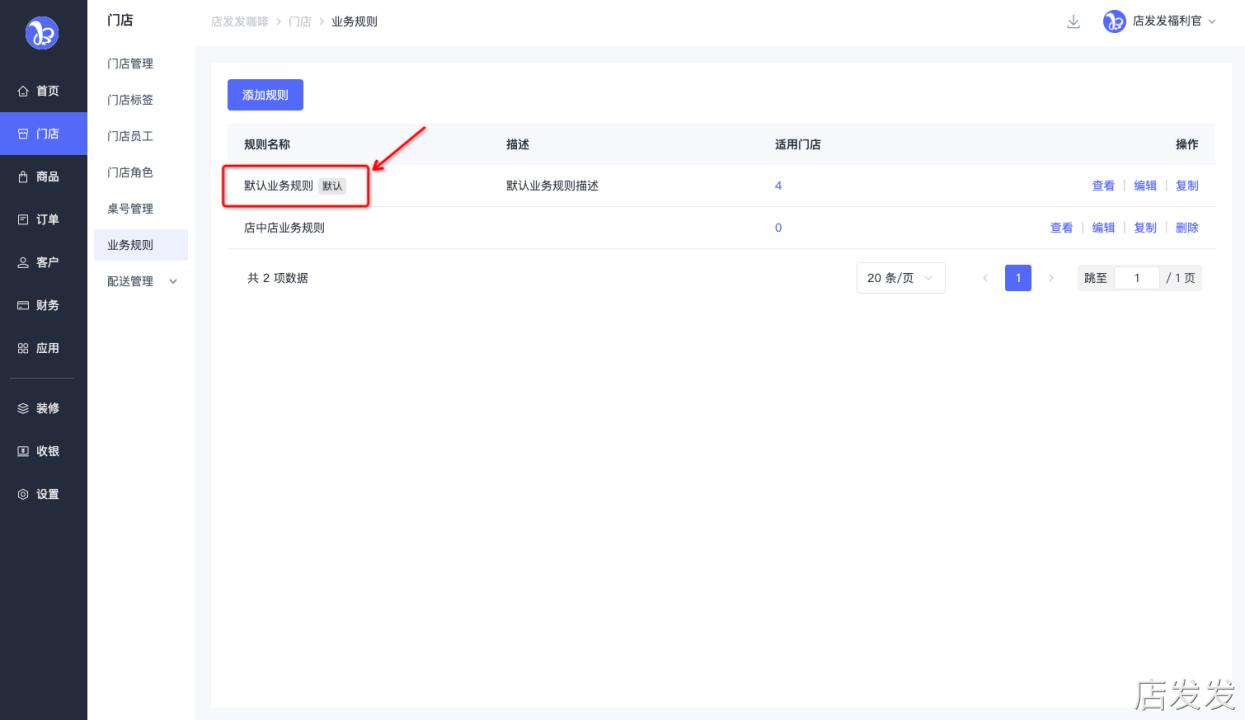 “默认业务规则”为系统默认生成的业务规则,用于品牌创建门店时门店默认使用的业务规则。品牌的多个门店常用的业务规则可统一使用默认业务规则。