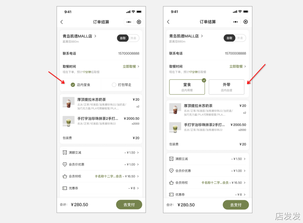 开启“取餐方式”后,客户在小程序下单时,可选择「堂食」或「自提」