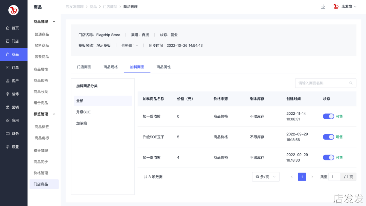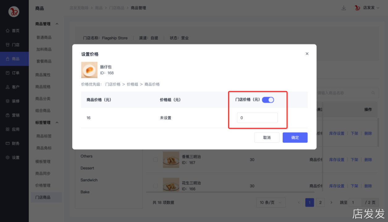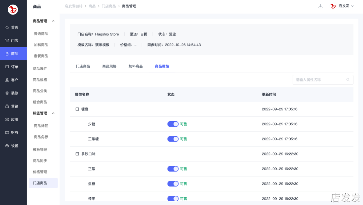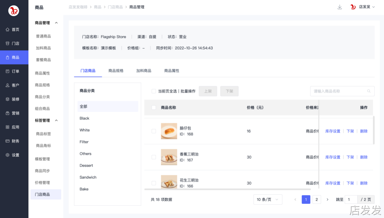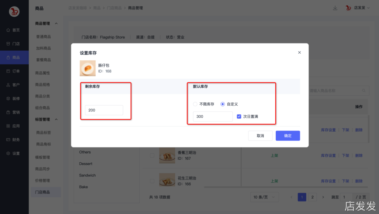 品牌在总部后台可管理门店不同业务(自提/外卖)的商品状态,商品价格和商品库存。