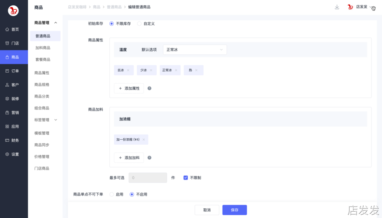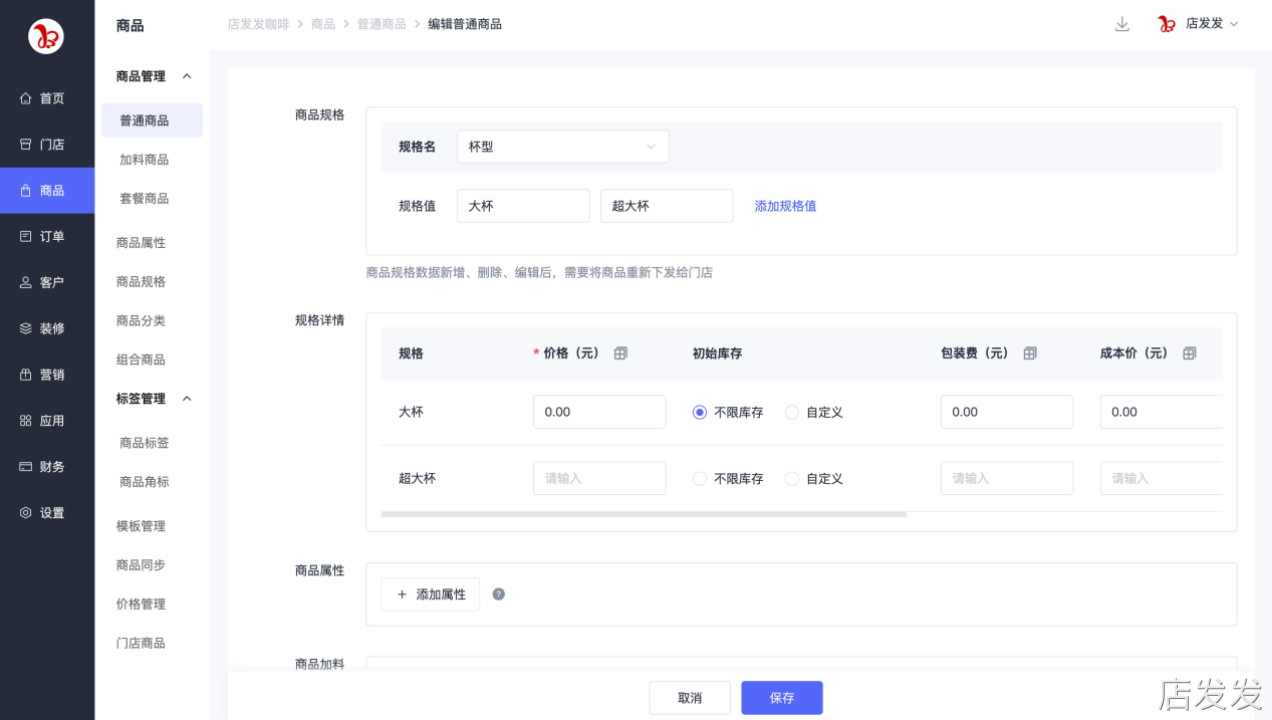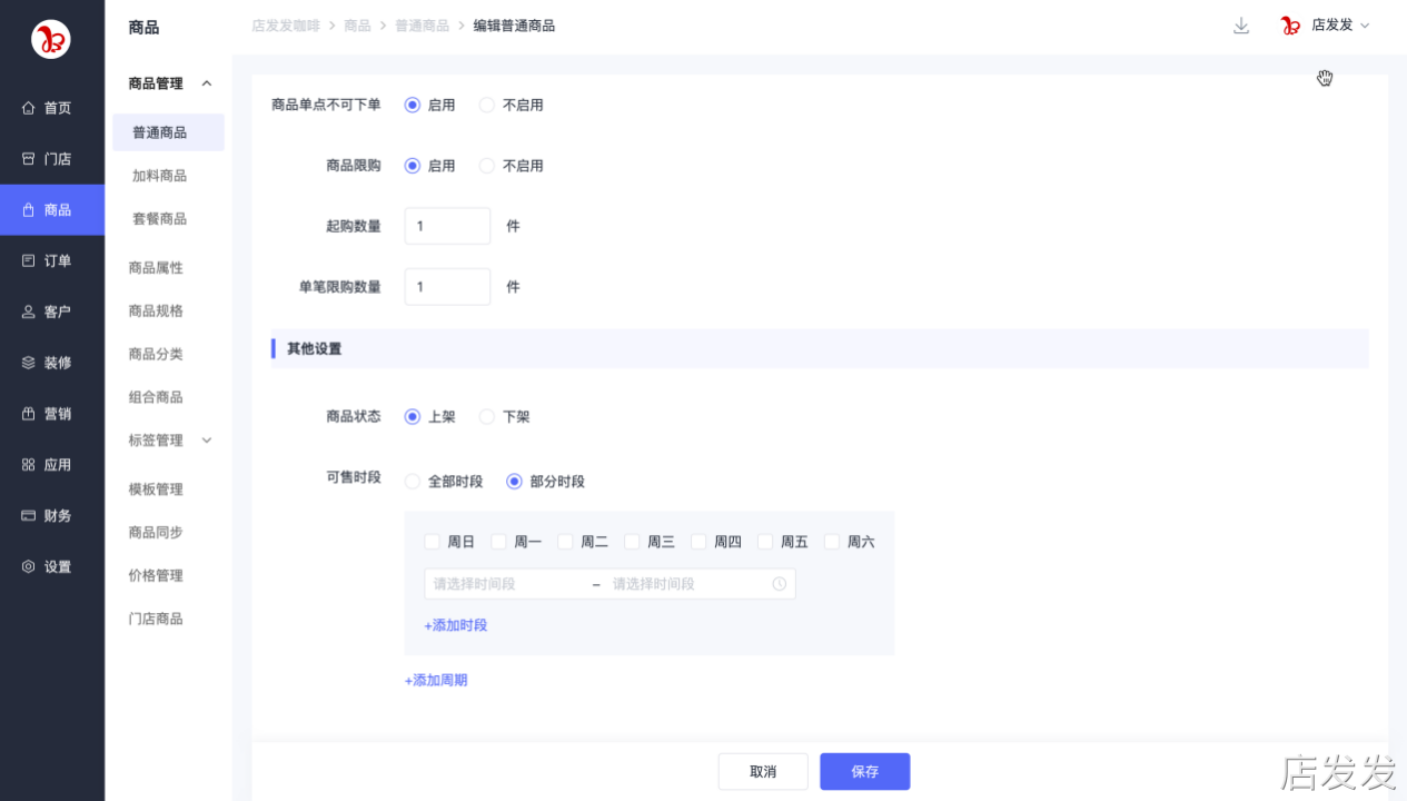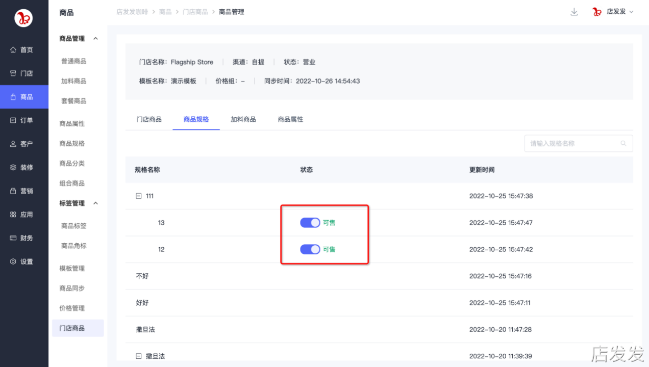 品牌在总部后台可管理门店不同业务(自提/外卖)的商品状态,商品价格和商品库存。