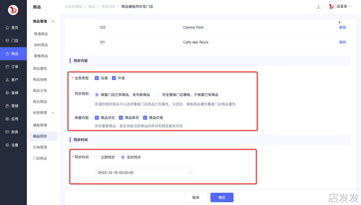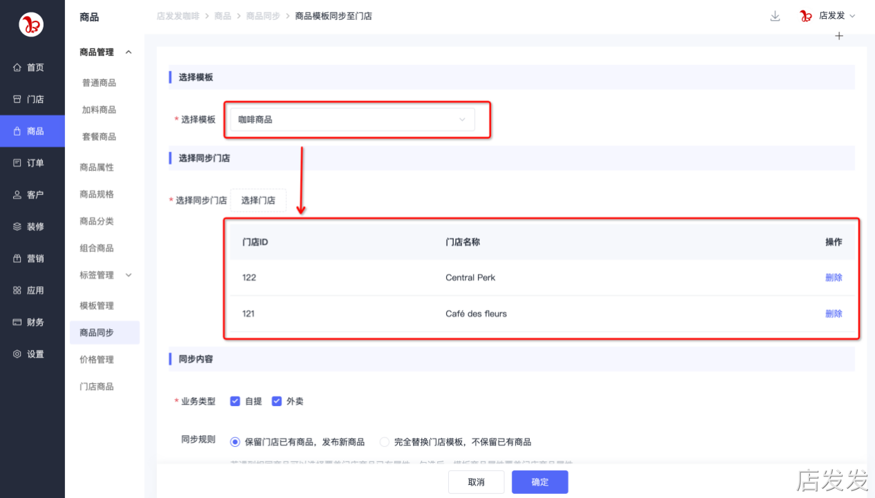 同步内容:业务类型 - 可选择模板商品要同步的业务类型