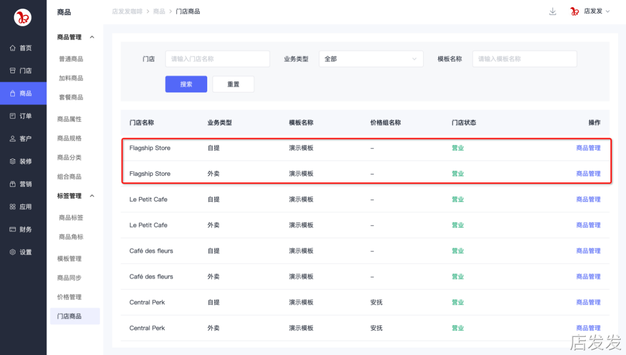 品牌统一创建和管理的商品,由品牌确定不同门店可出售的商品和商品价格。