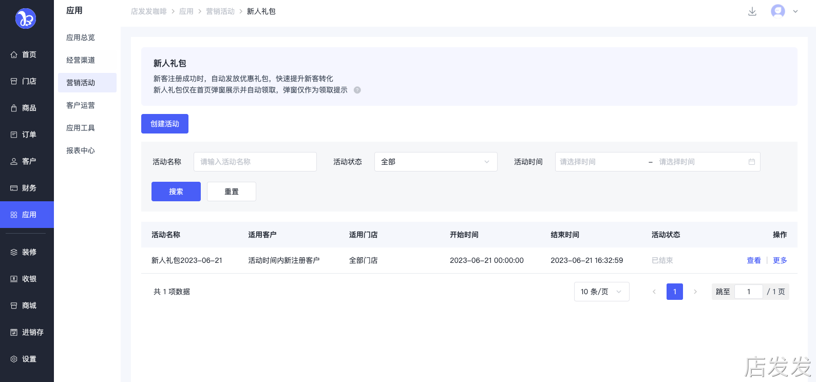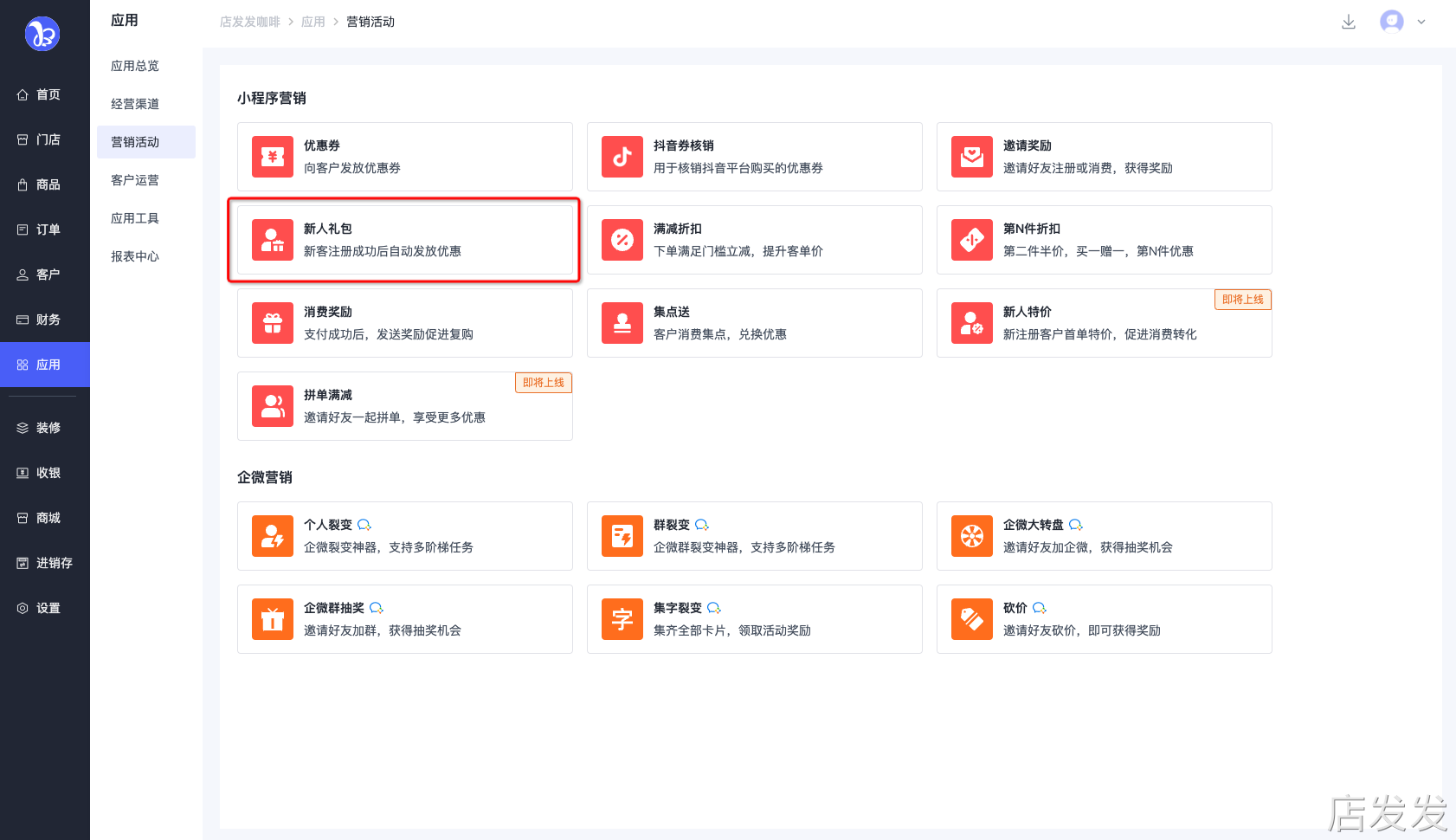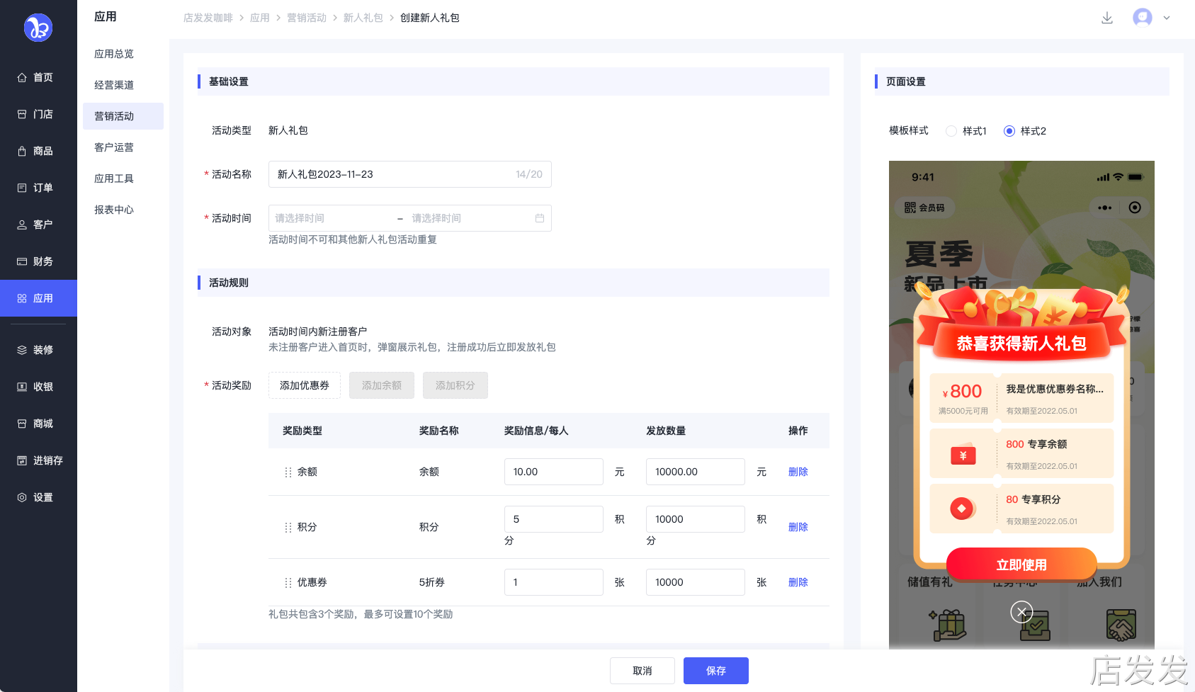 新人礼包:店发发品牌后台- 应用 - 营销活动 - 新人礼包