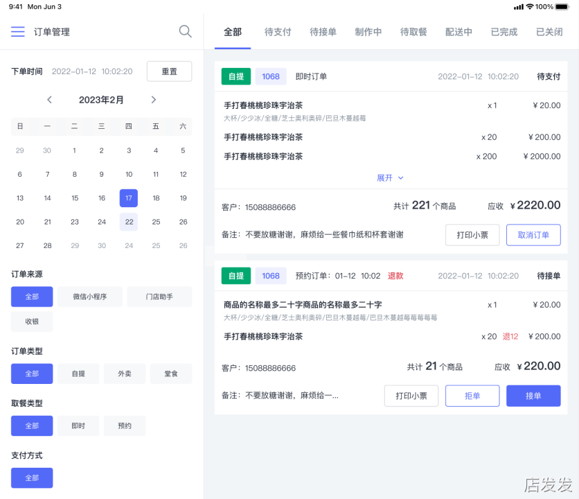 b. 订单来源筛选:小程序,门店助手,发发收银