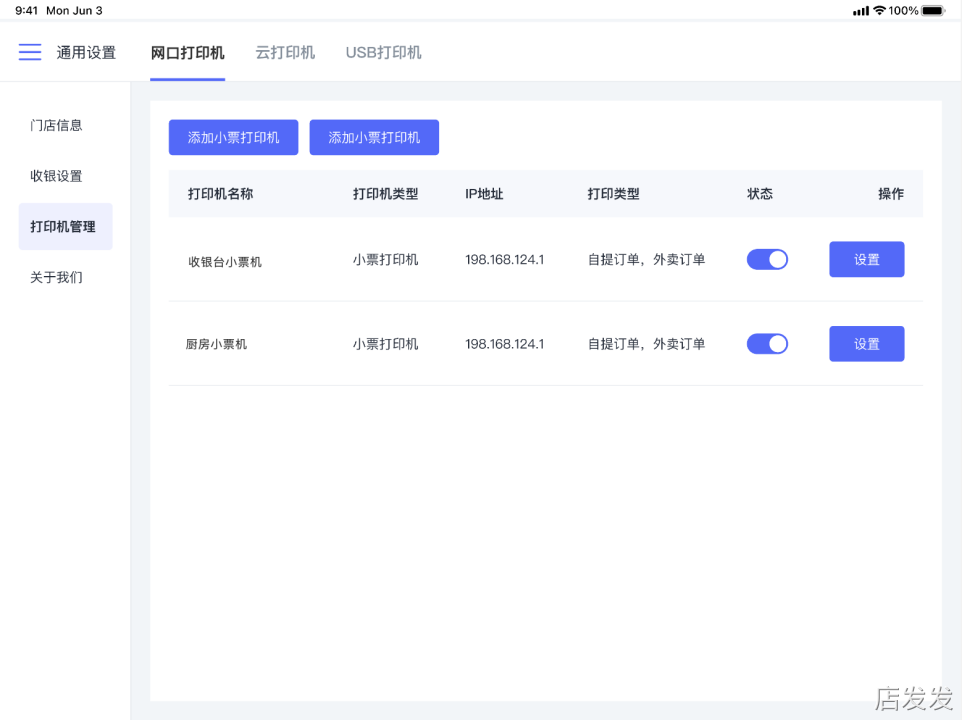打印机类型:网口打印机(芯烨),USB打印机(芯烨),云打印机(飞蛾)