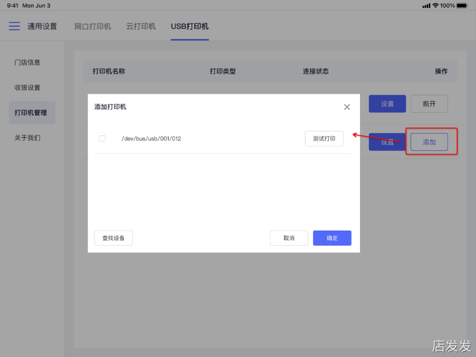 将打印机USB插口插入收银设备,系统会自动识别打印机