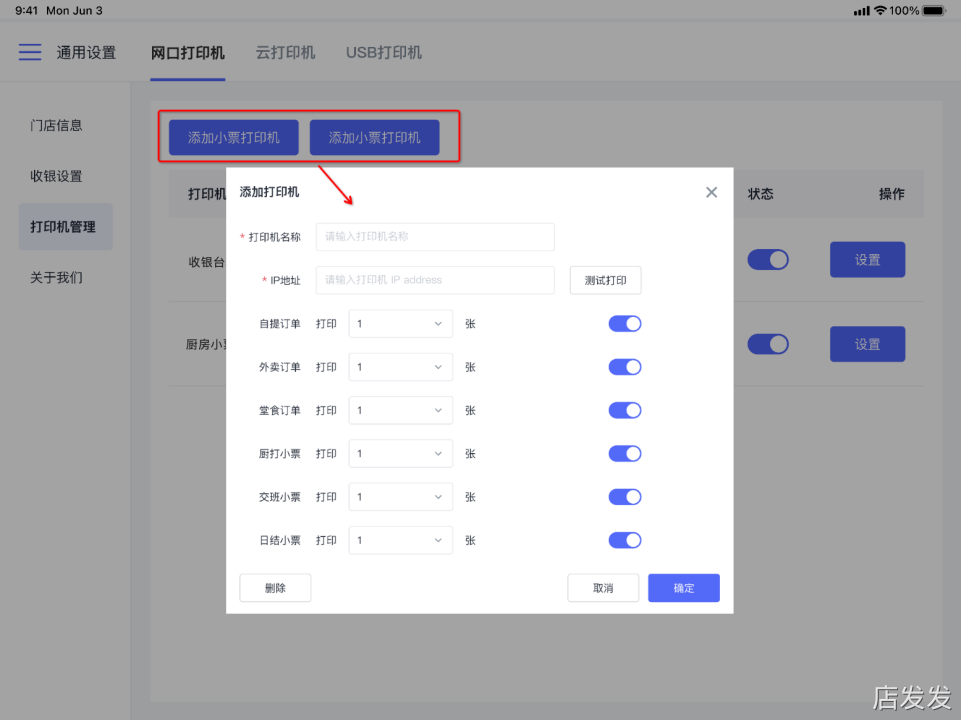 设置打印机名称,打印机IP地址,设置打印类型和打印张数