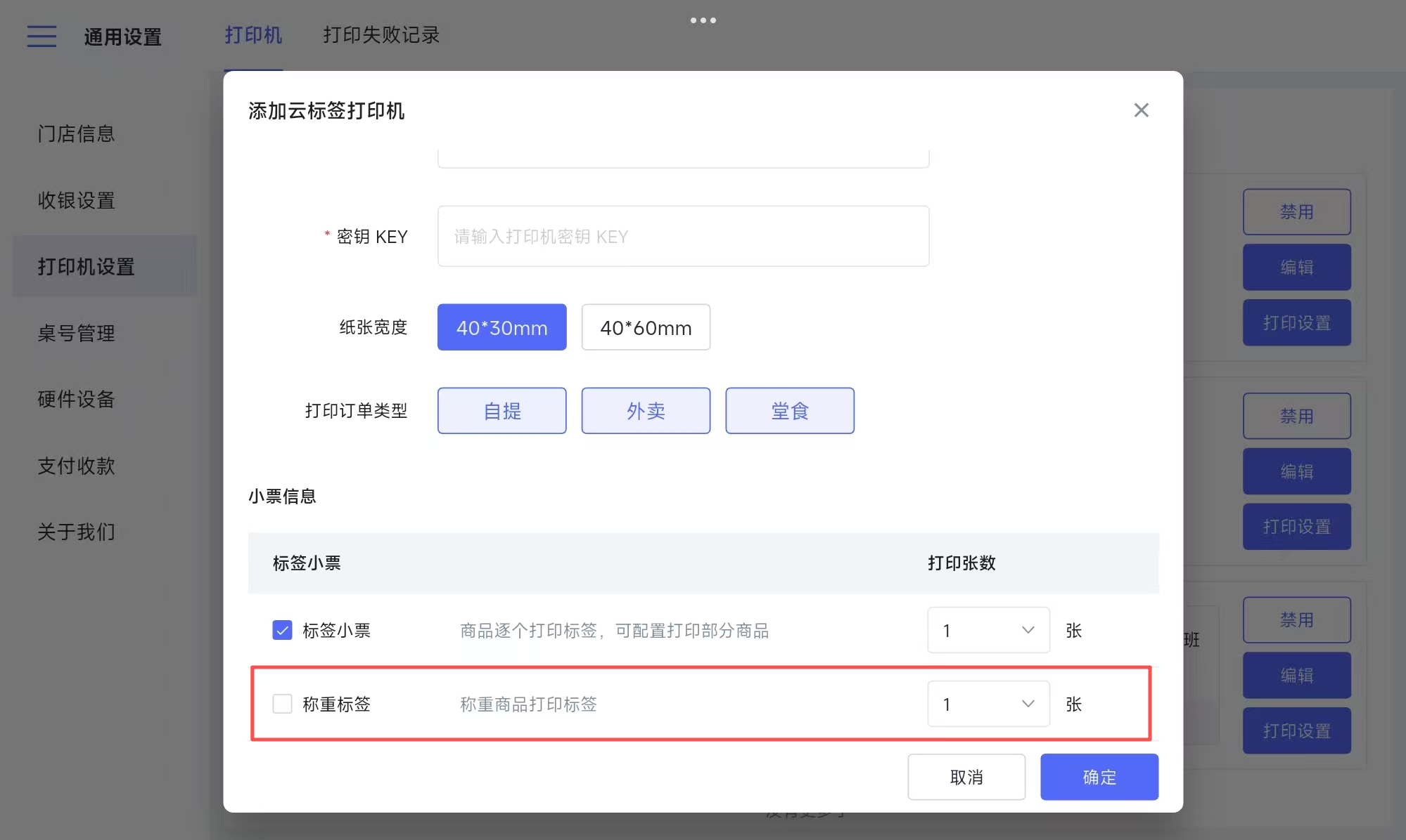 打印机添加称重标签路径:品牌后台-应用-应用工具-门店打印机-打印机管理