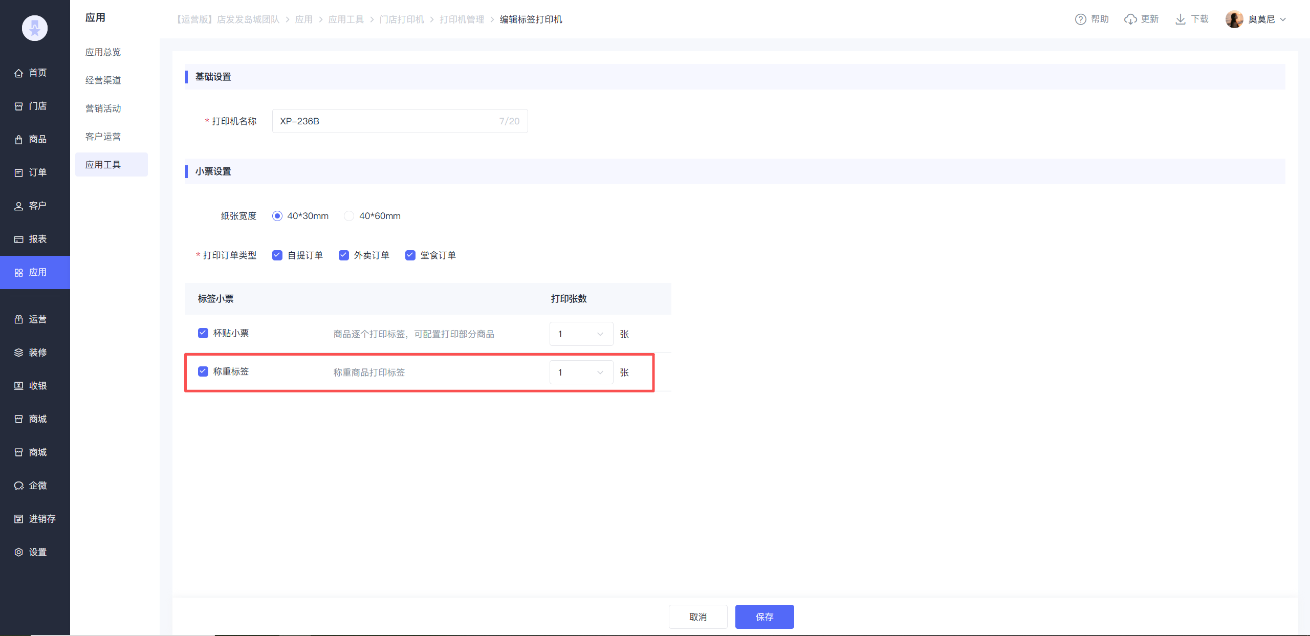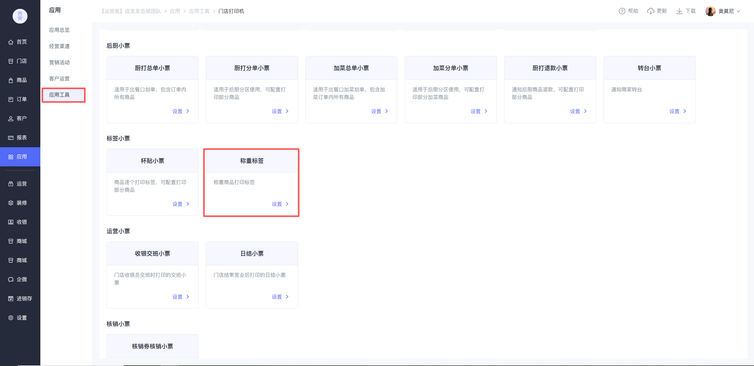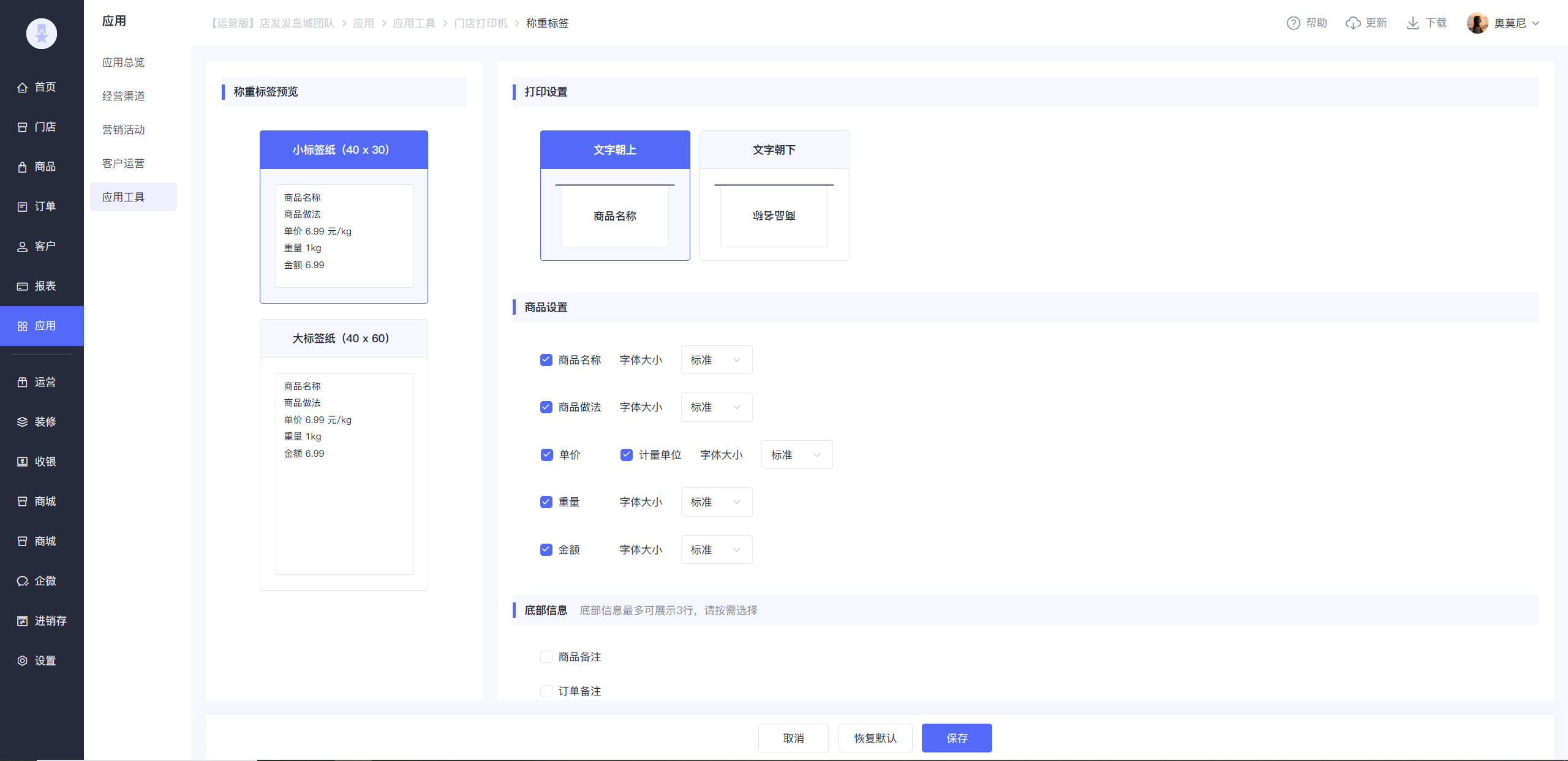称重标签设置路径:品牌后台-应用-应用工具-门店打印机-称重标签